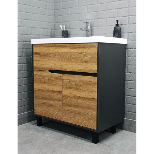Тумба с раковиной Домино Карат (Karat) 80 напольная, 80 см, черная, матовая, из МДФ, с ящиками, с дверками, раковина для ванной, из искусственного мрамора, прямоугольная лофт