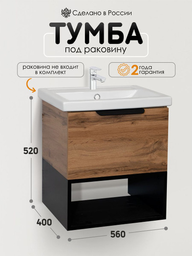 GLAV mebel Тумба под раковину в ванную подвесная, тумба для ванной Kleo 60, 60*40*52 см, Дуб вотан+черный