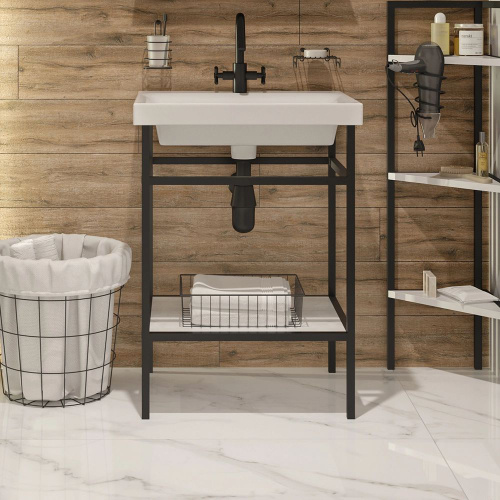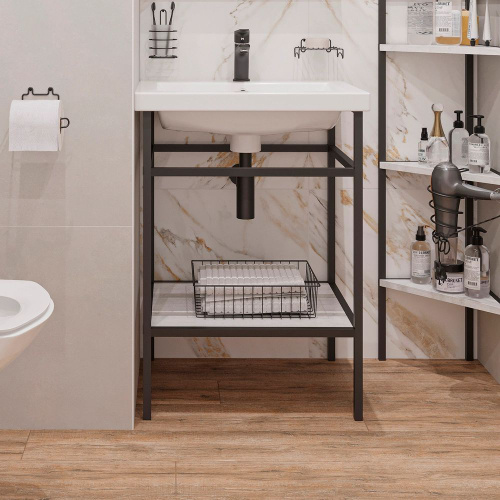 Консоль с раковиной STWORKI Эстфолл с полкой, 55 см, черная, матовая, металлическая, раковина для ванной фаянсовая, со встроенным сливом-переливом, в стиле лофт