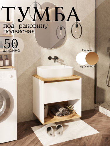 Тумба под раковину в ванную подвесная, 50 см, Белый/Дуб вотан