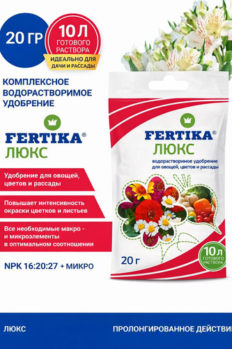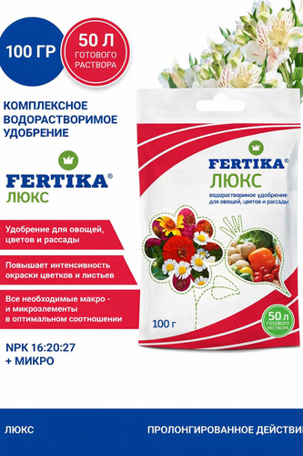 Удобрение ФЕРТИКА ЛЮКС для овощей, цветов и рассады 100 г. Стимулирует бутоно- и плодообразование, удлиняет период цветения, повышает интенсивность окраски соцветий и листьев.