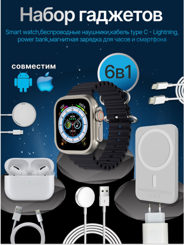 Смарт часы. Набор умные часы 6 в 1, беспроводные наушники, зарядка для телефона,беспроводная магнитная зарядка для айфона и часов.