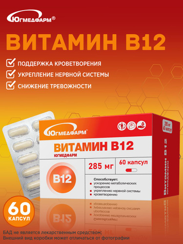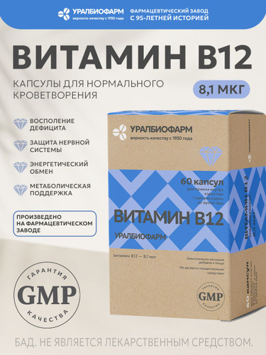 Витамин В12, 60 капсул, цианокобаламин 8,1 мкг/ витамин b12, бад для поддержки сердечно сосудистой и нервной системы, УралБиоФарм