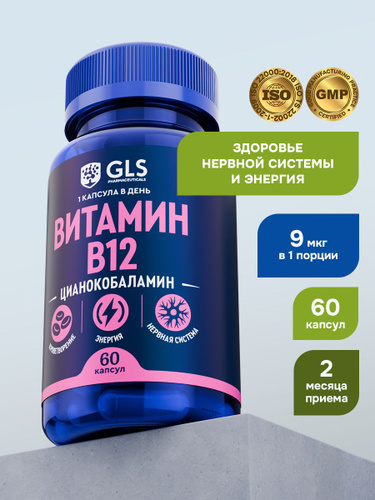 Витамин В12 9мкг (цианокобаламин / витамин b12), бад для энергии и поддержки нервной системы, 60 капсул