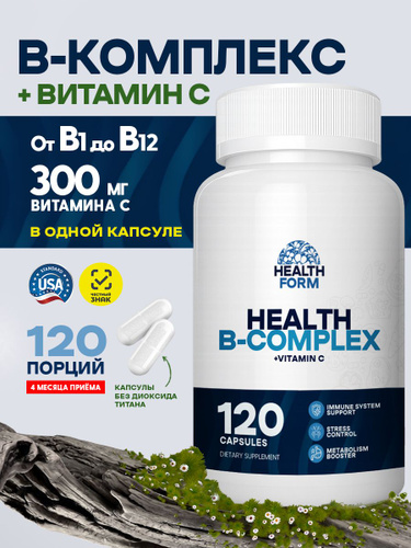 Витамины группы В + Витамин С 120 капсул, Health Form Vitamin B-Complex + Vitamin C, Для взрослых, Комплекс для поднятия гемоглобина, иммунитета