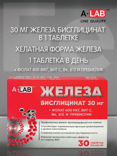 БАД Железо бисглицинат+фолат+вит С, В6, В12 и пребиотик, 30 таблеток