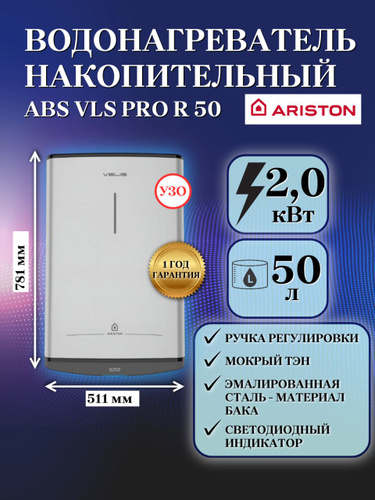 ARISTON (Аристон) водонагреватель накопительный ABS VLS PRO R 50, плоский, 50 литров, УЗО, электрический накопительный бойлер