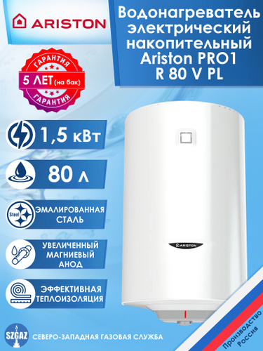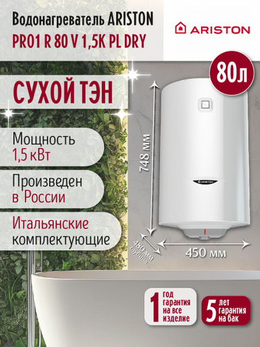 Водонагреватель электрический Ariston PRO1 R DRY 80 V 1,5K PL (1,5 кВт, кругл, СУХОЙ ТЭН), 3700622
