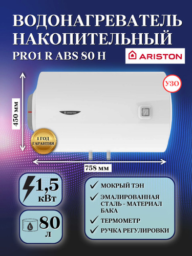 ARISTON (Аристон) водонагреватель накопительный PRO1 R ABS 80 H, 80 л, горизонтальный, мокрый ТЭН, электрический накопительный бойлер, УЗО