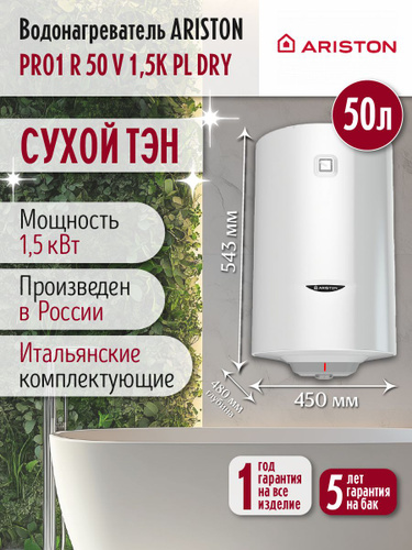 Водонагреватель накопительный 50 литров Ariston PRO1 R 50 V 1,5K PL DRY (сухой тэн) круглый настенный электрический