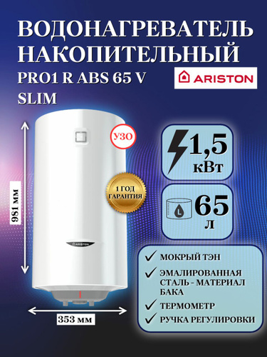 ARISTON (Аристон) водонагреватель накопительный PRO1 R ABS 65 V SLIM, 65 литров, узкий, 1.5 кВт, УЗО, электрический накопительный бойлер, мокрый ТЭН