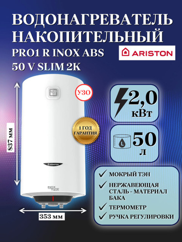 ARISTON (Аристон) водонагреватель накопительный PRO1 R INOX ABS 50 V SLIM 2K, 50 литров, УЗО, электрический накопительный бойлер, мокрый ТЭН