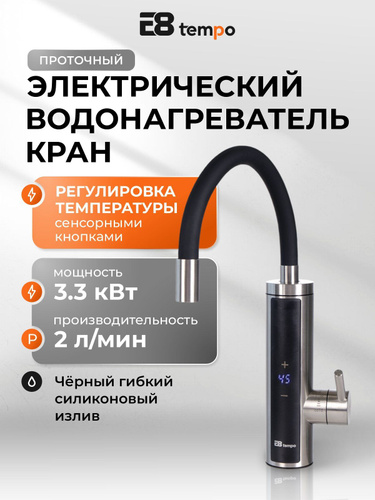 Водонагреватель регулируемый проточный электрический E8 tempo (кран с чёрным силиконовым гибким изливом) E8-S6-10D, мощность 3,3 кВт