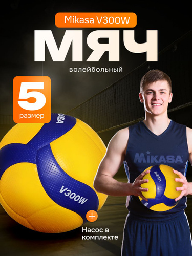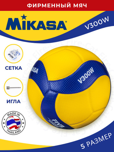 Мяч волейбольный Mikasa V300W +игла +сетка, 5 размер, желтый, синий