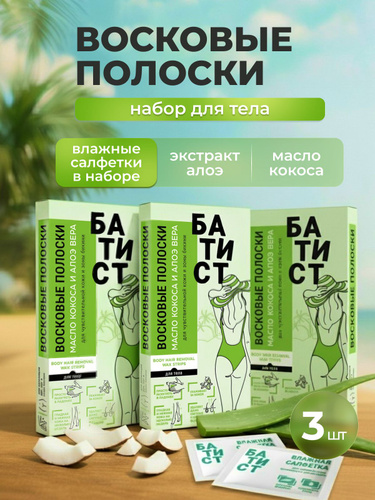 Батист Восковые полоски для депиляции тела и бикини для чувствительной кожи с маслом кокоса и алое вера, набор 3 уп х 12 шт