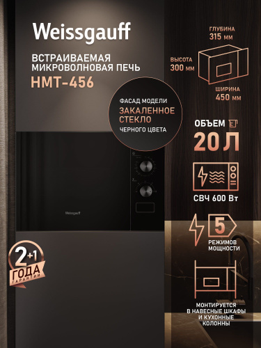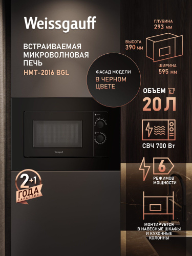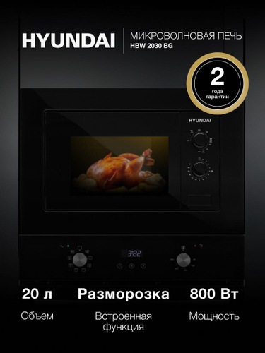 Встраиваемая Микроволновая Печь Hyundai HBW 2030 BG, 20 л, механическое управление, Гриль 1000 Вт, камера из нержавеющей стали, комбинированные режимы СВЧ+гриль, Таймер 35 мин, черный