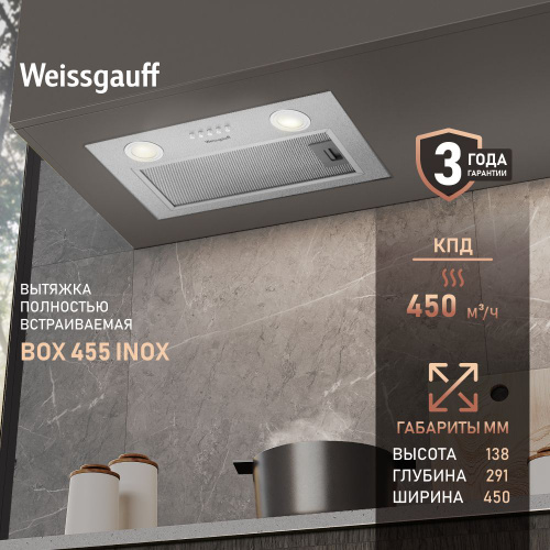 Вытяжка кухонная встраиваемая Weissgauff BOX 455 Inox, Производительность 600 м3/ч, 3 скорости, Низкий уровень шума 49 дБ, Режимы отвод и циркуляция, LED освещение