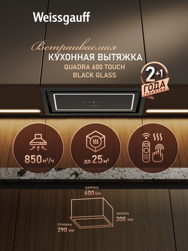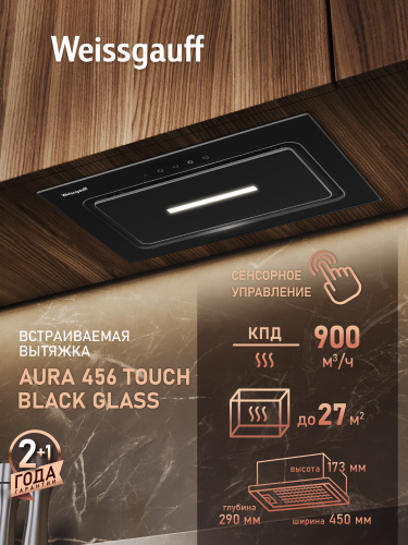 Вытяжка кухонная встраиваемая Weissgauff Aura 456 Touch Black Glass, Производительность 900 м3/ч, 3 скорости, Низкий уровень шума 47 дБ, Режимы отвод и циркуляция, LED освещение, Сенсорное управление