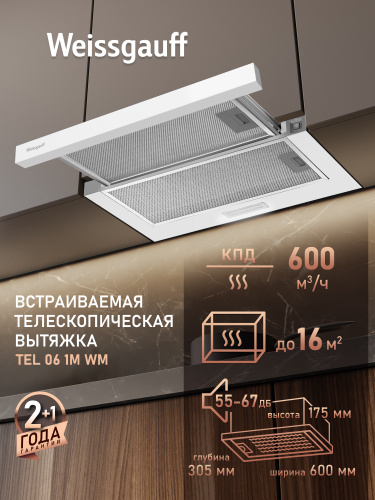 Вытяжка кухонная встраиваемая Weissgauff TEL 06 1M BM, Производительность 600 м3/ч, Низкий уровень шума, Слайдерная технология, Режимы отвод и циркуляция, Алюминиевый жировой фильтр, LED-освещение