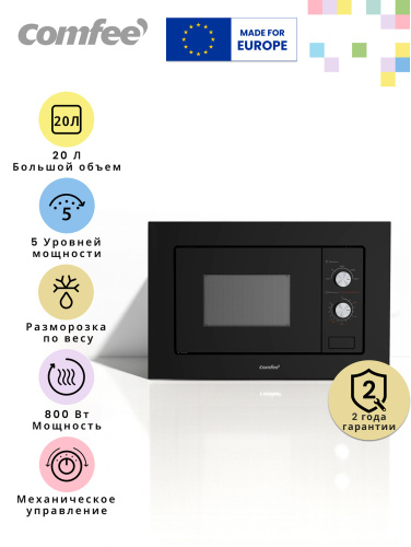 Встраиваемая микроволновая печь Comfee CBM200GB, 800 Вт, поворотный стол, камера 20 л, 8 автопрограмм, размораживание, черное стекло