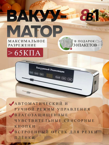 Вакууматор для продуктов с резаком 8в1/Вакуумный упаковщик с 30 пакетами.