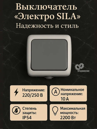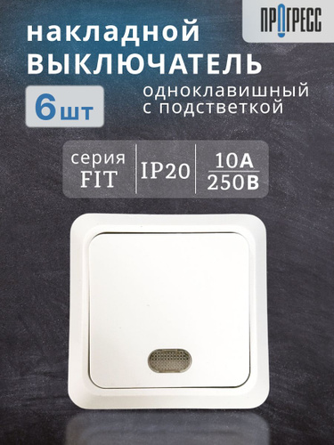 Выключатель накладной одноклавишный с подсветкой ПРОГРЕСС FIT IP20 10А 250В, 6шт., негорючий ABS пластик, медные контакты, белый цвет.