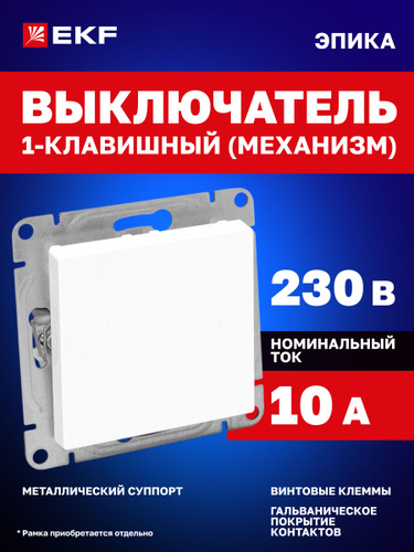 Выключатель одноклавишный 10А, белый Эпика EKF (механизм, рамка под необходимое количество постов приобретается отдельно)