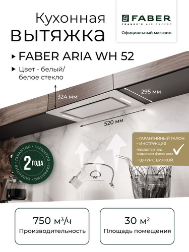 FABER ARIA WH 52 встраиваемая вытяжка, Цвет белый, Производительность 750 м3/ч, Ширина шкафа 60 см, 3 скорости, LED освещение, Режимы отвода/рециркуляции, Периметральное всасывание