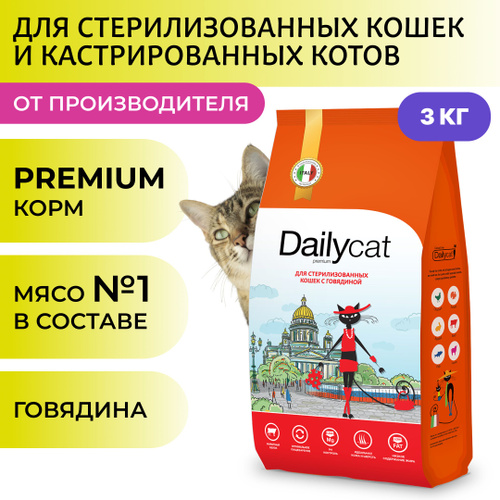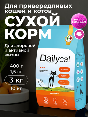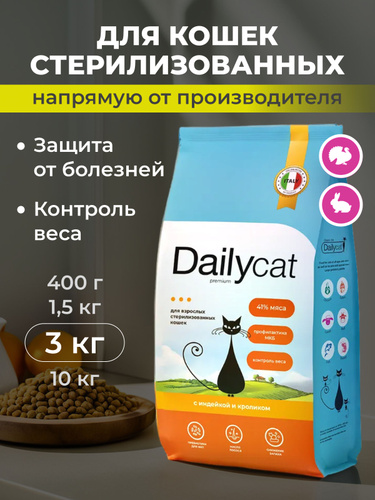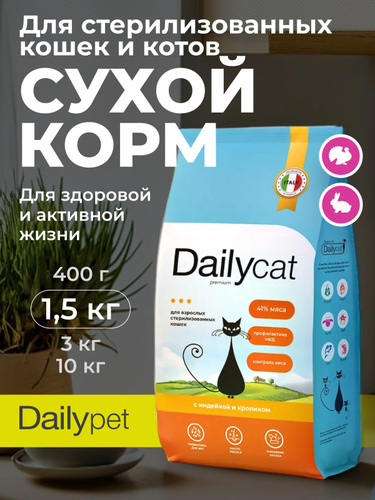 Корм сухой Dailycat для стерилизованных кошек и котов, с индейкой и кроликом, 1,5 кг