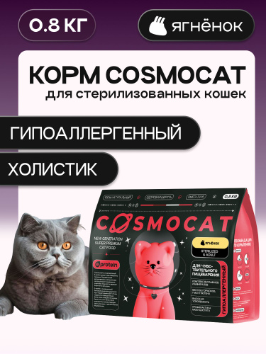 Корм сухой для стерилизованных кошек и котов Cosmocat от Cosmopet с ягненком 0,8 кг, гипоаллергенный холистик супер премиум класса