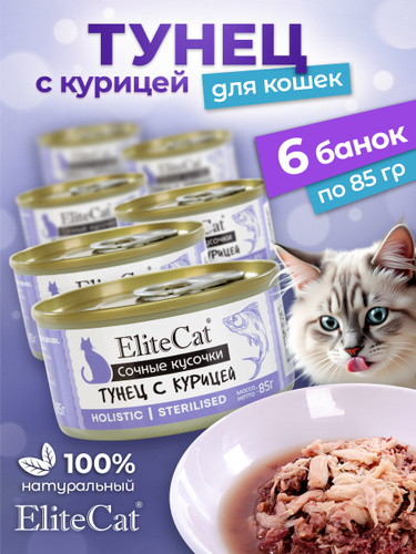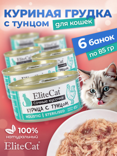Корм лакомство для кошек влажный ELITECAT консервы сочные кусочки "Тунец с курицей" 85гр (6 штук)