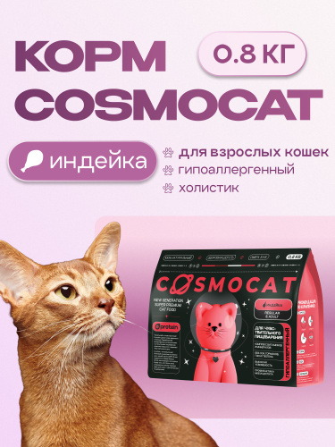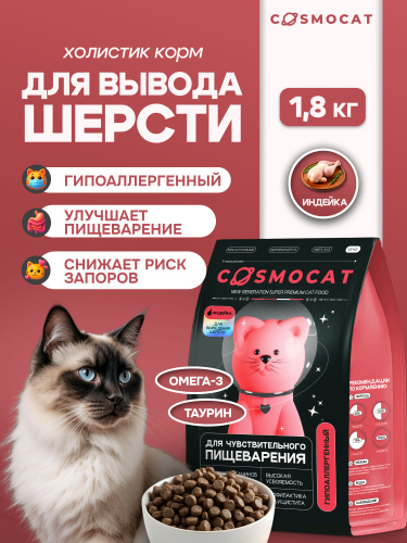 Корм для кошек сухой Cosmocat гипоаллергенный с индейкой для профилактики волосяных комочков 1,8 кг
