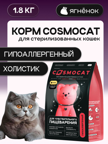 Корм сухой для стерилизованных кошек и котов Cosmocat от Cosmopet с ягненком 1,8 кг, гипоаллергенный холистик супер премиум класса