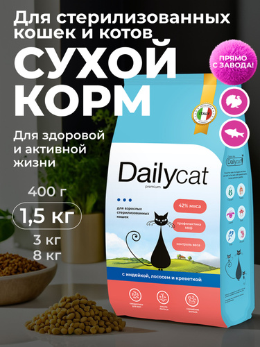 Корм сухой Dailycat для стерилизованных кошек и котов, с индейкой, лососем и креветкой, 1,5 кг