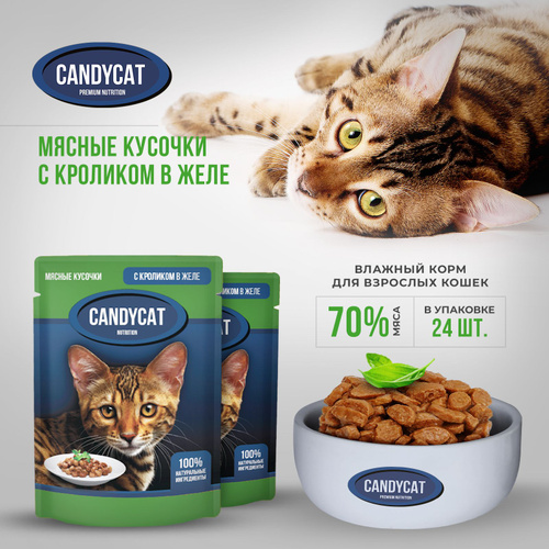 Влажный корм для кошек Candycat, Мясные кусочки с кроликом в желе, 24 шт по 85 г