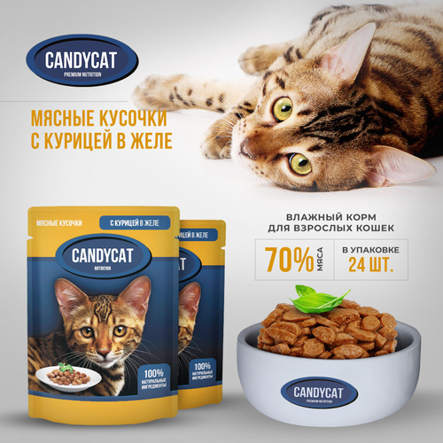 Влажный корм для кошек Candycat, Мясные кусочки с курицей в желе, 24 шт по 85 г