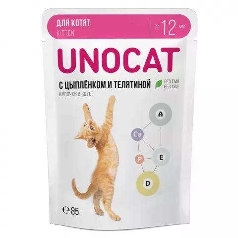 UnoCat Влажный корм для котят нежные кусочки с цыпленком и телятиной в соусе, 85гр (5 шт)