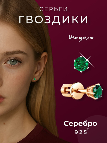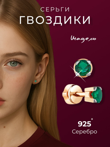 Серьги женские серебро 925 золотые гвоздики ювелирные украшения изумруд иск.