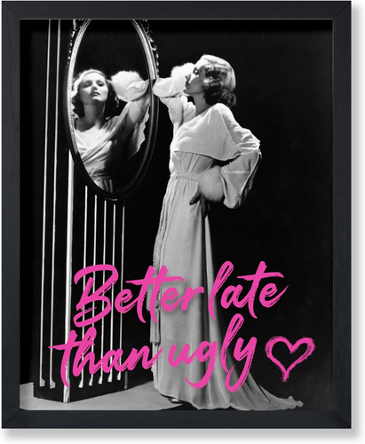 Постер "Женщина у зеркала, измененное искусство, поп-арт, лозунг "Лучше опоздать, чем быть некрасивой". Для Ванная комната.", 75 см х 50 см