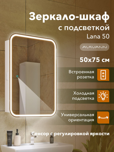 Зеркало-шкаф Lana 50x75 см с подсветкой и сенсорным выключателем, c регулировкой яркости, в ванную, навесной