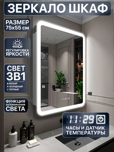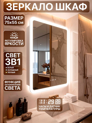 Зеркало-шкаф в ванную 75х55 см с подсветкой, сенсорное, 3 режима света, часы и датчик температуры, навесной шкаф для ванной, белый, вправо