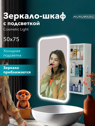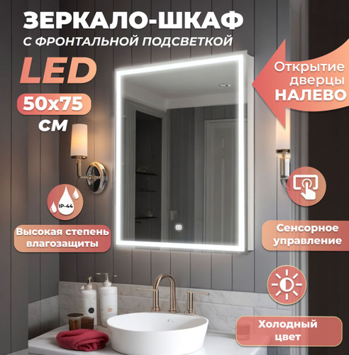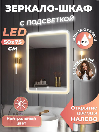 Зеркало-шкаф Мира 50 с холодной подсветкой, 50х75х14 см