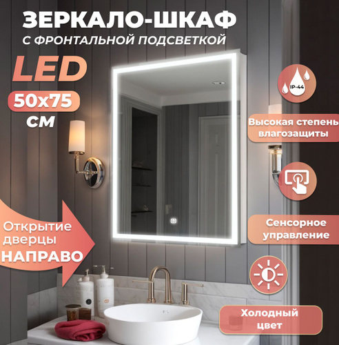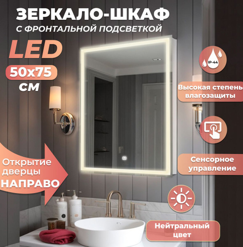 Зеркало-шкаф Мира 50 с нейтральной подсветкой правое, 50х75х14 см
