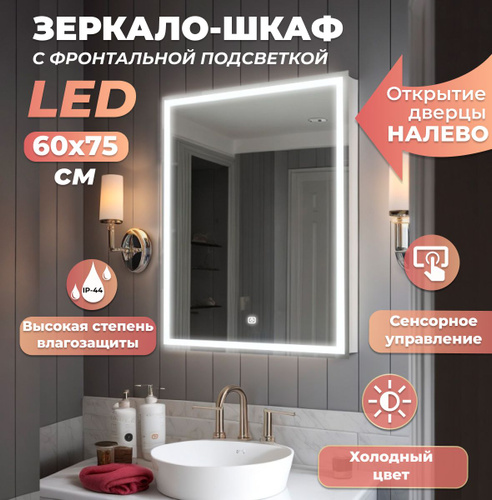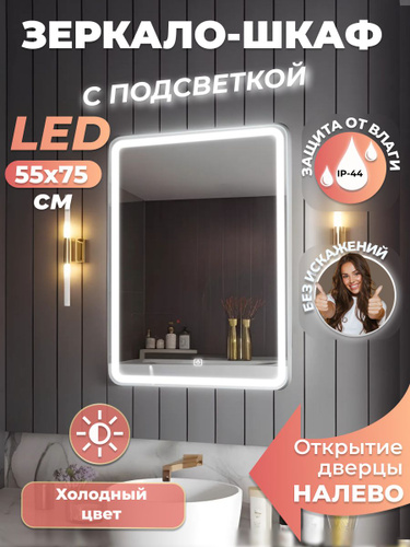 Зеркало-шкаф в ванную 75х55 см с подсветкой, сенсорное, 3 режима света, часы и датчик температуры, навесной шкаф для ванной, белый, влево