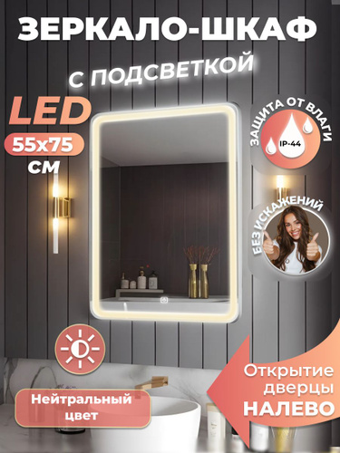 Зеркало-шкаф Мира 55 с нейтральной подсветкой левое, 55х75х14 см