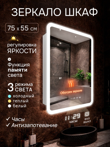 Зеркало-шкаф в ванную 75х55 см с подсветкой, сенсорное, 3 режима света, обогрев, часы и датчик температуры, навесной шкаф для ванной, белый, вправо