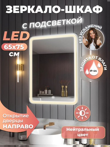 Зеркало-шкаф Мира 65 с нейтральной подсветкой правое, 65х75х14 см
