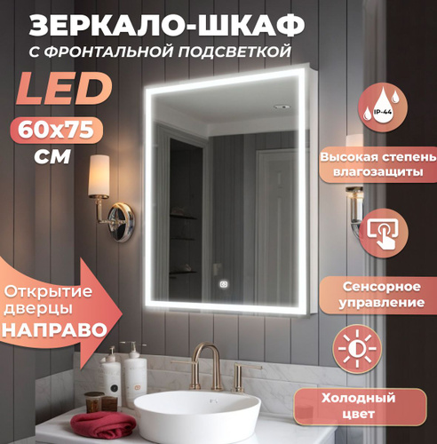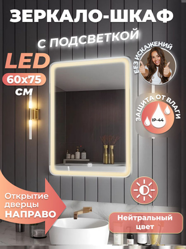 Зеркало-шкаф Мира 60 с нейтральной подсветкой правое, 60х75х14 см