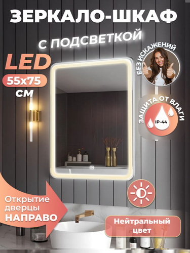 Зеркало-шкаф Мира 55 с нейтральной подсветкой правое, 55х75х14 см