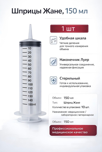 Большой Шприц Жане 150 мл медицинский и технический, для инъекций, смазки и заливки масел, откачки жидкости 1 шт.